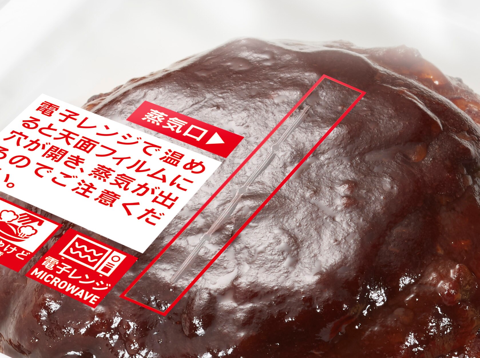 今回改善したかったお客様のお困りごととして、一般的な「ちょい開け」や他社の自動蒸通方式では、店舗での電子レンジ加温後に、オペレータさん達が袋づめするときや、購入したお客様が製品を持ち帰る際に、容器が斜めになったり振動が加わることで、内容物から汁が漏れ出て、この商品自体が汚れるだけでなく、おいしさが損なわれてしまう恐れもあり、また一緒に袋づめされた他の商品にも汁が付着して汚してしまう恐れがあるという問題でした。