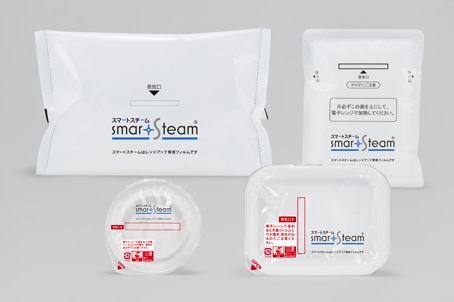 スマートスチームは、既存のトレーシーラー機で簡単に導入できるトップシールをはじめ、ピロー包装やスタンドパウチなど、様々な形態をラインナップしています。フィルムの材質についても、PETやOPP、ガスバリア仕様にいたるまで、内容物に合わせてお選びいただけます。さらに、安定した蒸気抜きのための新たなトレーの設計も、商品に最適なソリューションをご提案します。
